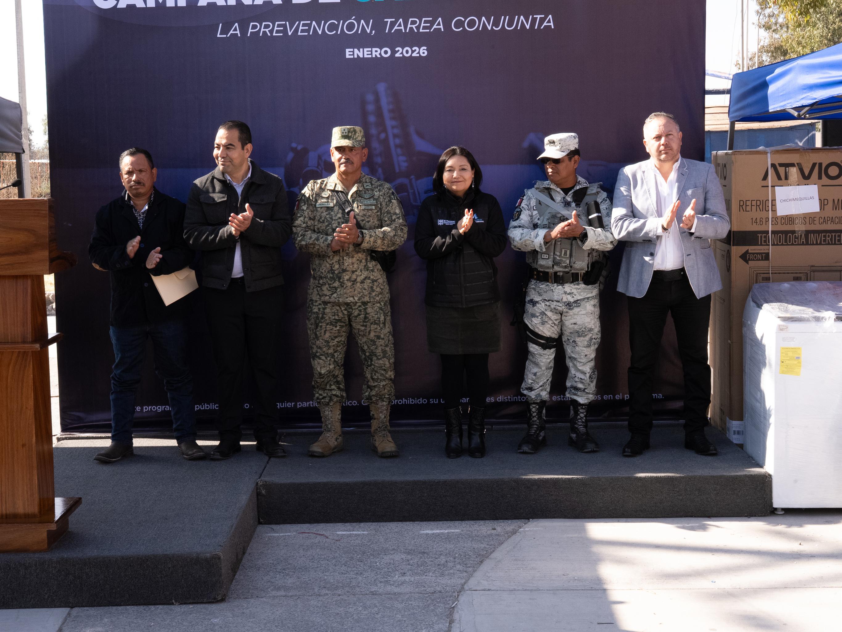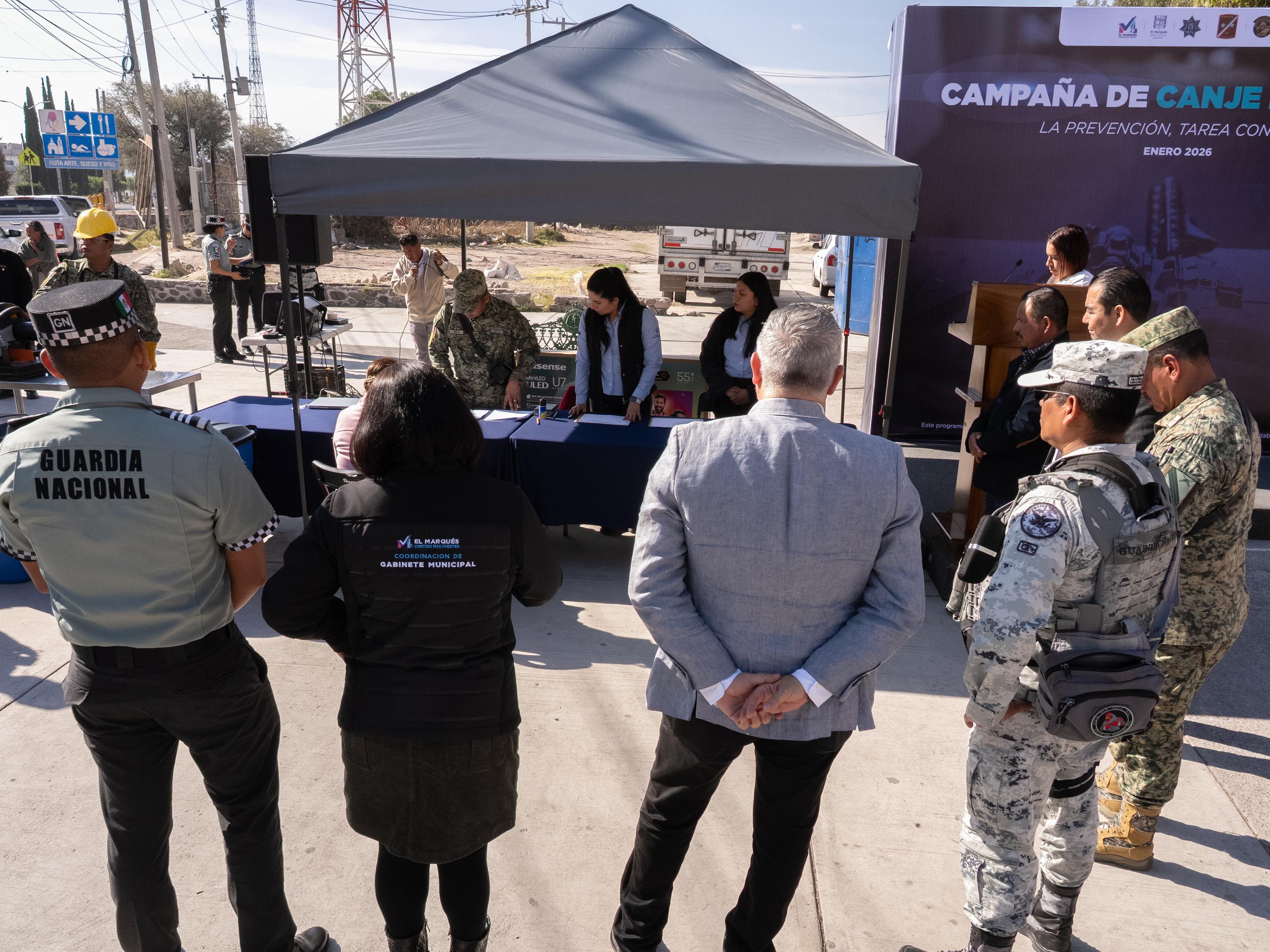 Al arranque del programa “Canje de Armas 2026” acudieron el Teniente Coronel José Ramón Pereyra Hernández, del 4º Regimiento de la 17ª Zona Militar; el Capitán Segundo de la Guardia Nacional, José Luis Cholula Esteban, perteneciente al 48 Batallón; el secretario de Seguridad Pública Municipal de El Marqués, Jorge Luis Barrera Rangel; el secretario de Gobierno de El Marqués, Alejandro Meré Montes, y el delegado de Chichimequillas, Guillermo Jaramillo Cruz.
