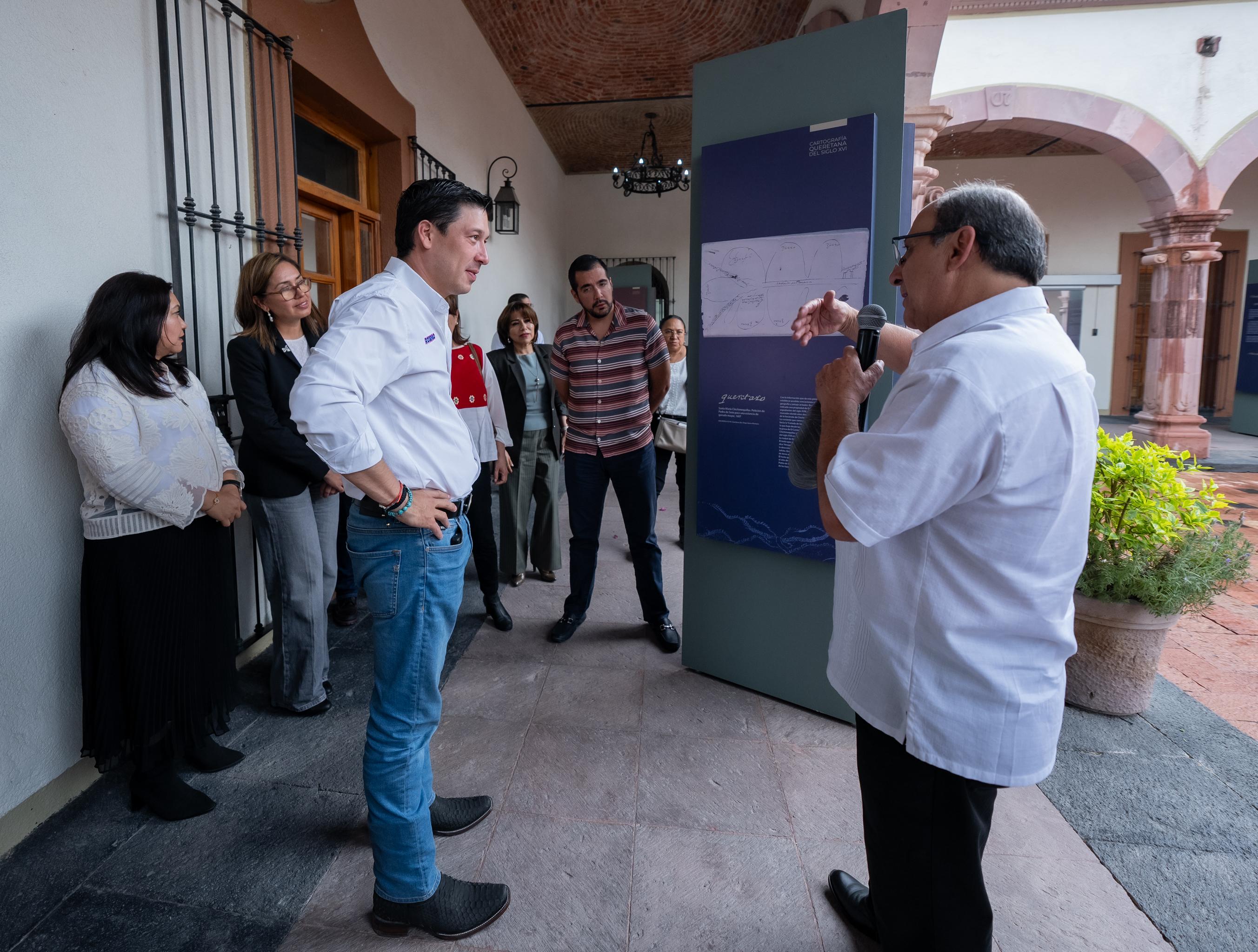 Asimismo, se inauguró la exposición “E haréis pintar la tierra. Cartografía queretana del siglo XVI”, una muestra curada por el profesor investigador del INAH, Fernando González Dávila, que reúne reprografías de algunos de los mapas más antiguos del estado de Querétaro. Estas piezas históricas permiten conocer el proceso de conquista y la conformación territorial de la entidad durante los primeros años de la dominación española.